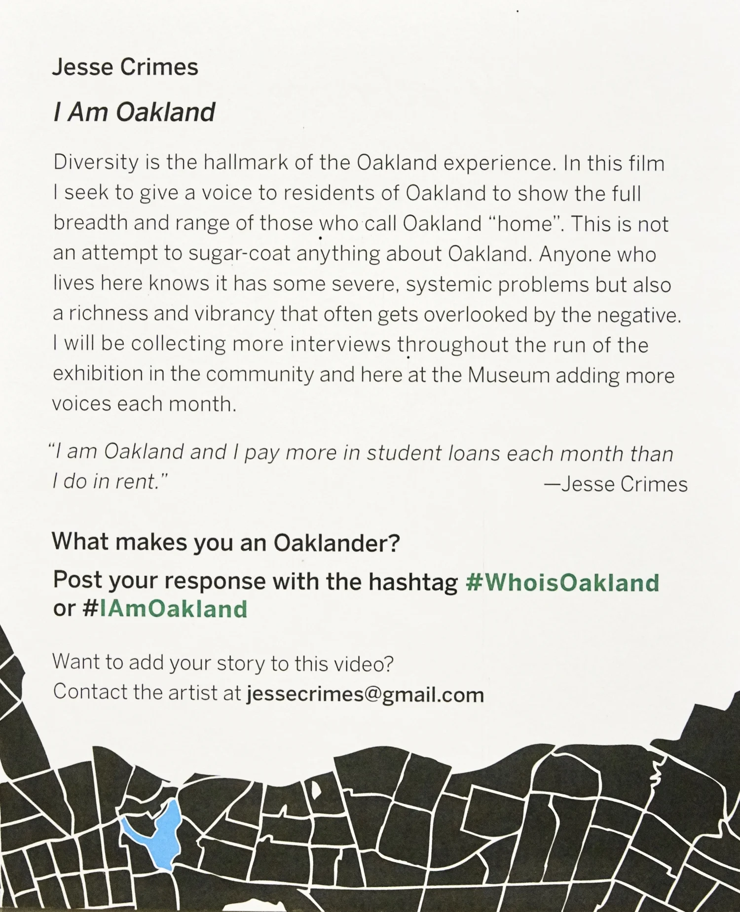 A 2-hour version of this project, chronicling about 60 different residents, was on display at the Oakland Museum of California from April 11th 2015 - July 12th, 2015 as part of the "Who Is Oakland" group show.